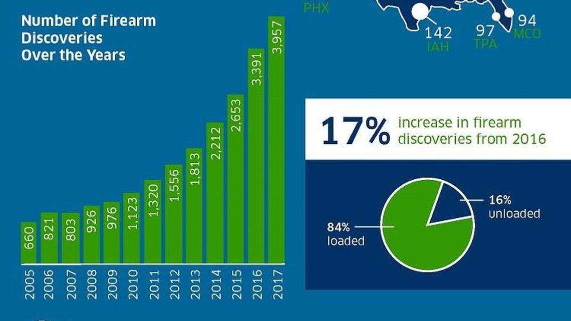 But the TSA says the number of guns found at airport security checkpoints continues to grow every year. Last year’s record of 3,957 firearms found in carry-on bags nationwide will be eclipsed again in 2018, said TSA spokeswoman Sari Koshetz.