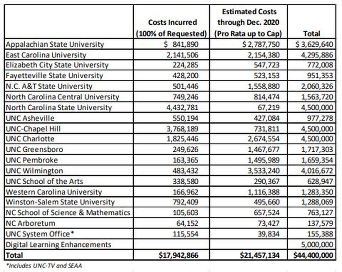 The state legislature allocated $44.4 million in coronavirus relief, which will be distributed to the 17 UNC System campuses, the UNC System office and the N.C. Arboretum. It also specifically notes $5 million in digital learning enhancements for the system.