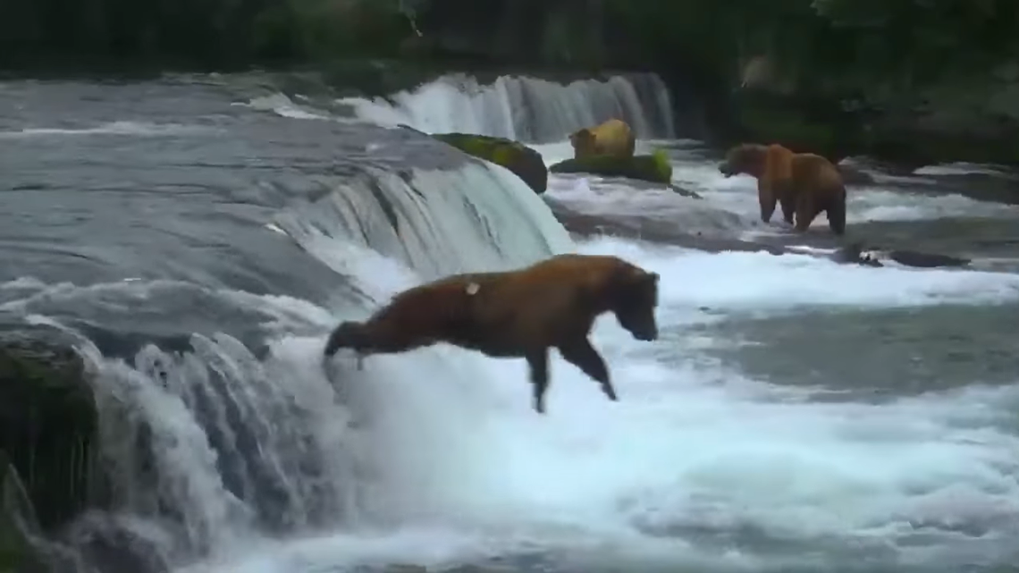 The camera captured a hungry brown bear belly flopping from a waterfall into the river below in Katmai National Park and Preserve in pursuit of a salmon dinner.