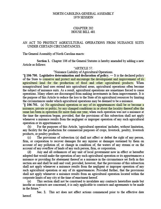 House Bill 481 (Feb. 22, 1979) Thomas Ellis, Jr., D-Vance; Toffie Auman, D-Moore; John Brown, R-Wilkes; Harold Brubaker, R-Randolph; and 32 others. States that changes in communities around farms could not be used as grounds for filing nuisance lawsuits against the farms. Farms operating improperly or with negligent owners could be sued.