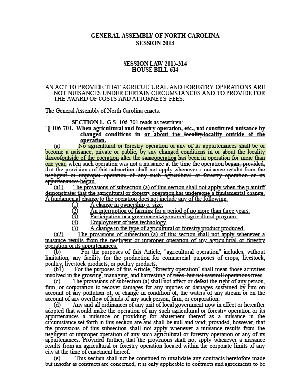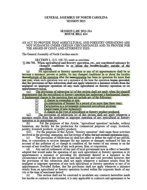 House Bill 614 (April 9, 2013) Nathan Ramsey, R-Buncombe; Michele Presnell, R-Yancey; and Kenneth Waddell, D-Columbus. After neighbors to hog farms in Eastern North Carolina filed lawsuits against large pork companies, this bill named changes that cannot be cited as a basis for nuisance lawsuits. Those include changes to what farms produce, their ownership, their size and the technology they use.