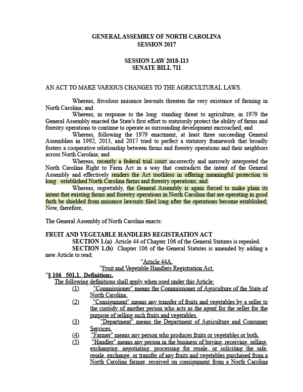 Senate Bill 711 (May 16, 2018) Brent Jackson, R-Sampson; Bill Cook, R-Beaufort; and Norm Sanderson, R-Pamlico. After neighbors started winning lawsuits against Smithfield Foods, this narrowed who is eligible to sue with nuisance claims. A plaintiff must live within a half-mile of a farm and file the complaint within a year of the farm’s opening.