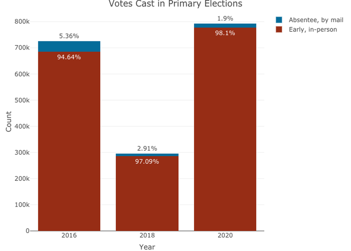 This year, 98% of the nearly 800,000 early voters cast in-person, also called one-stop, ballots during the early voting period which opened Feb. 13 and closed Saturday afternoon. Mail-in ballots made up the remaining 2%.