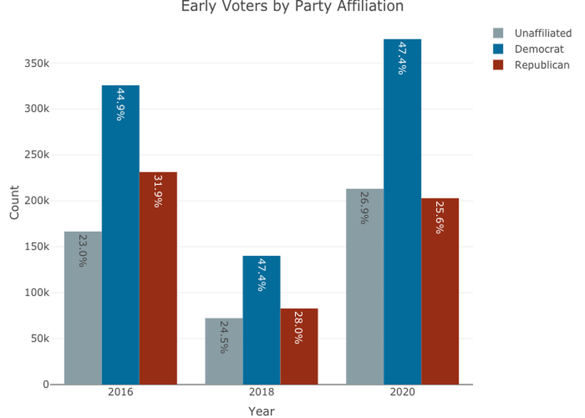 Those splits were slightly different in 2016, where nearly 45% of early voters were registered Democrats, nearly 32% Republican and 23% unaffiliated.