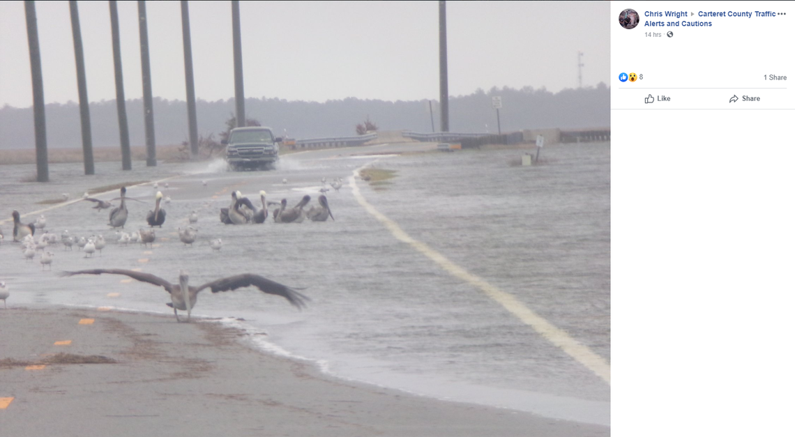 The situation was best summed up in a photo shared Sunday by Carteret County Emergency Services, which showed a pickup driver facing off with gulls and pelicans that were shamelessly swimming on N.C. 12.