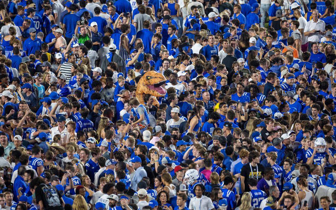 Duke fans storm the field to celebrate their 28-7 victory over Clemson on Monday, September 4, 2023 at Wallace Wade Stadium Stadium in Durham, N.C. Robert Willett rwillett@newsobserver.com